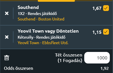 - Yeovil Town - Ebbsfleet Utd.: A Yeovil három ponttal érkezik a mérkőzésre, miután legutóbb 1-0-ra győzött idegenben a Braintree Town ellen. Mark Cooper edző elégedett lehetett csapata teljesítményével, különösen azután, hogy az első meccsükön vereséget szenvedtek a Hartlepool Unitedtól. A Yeovil a National League South bajnokaként jutott fel, és az első idegenbeli győzelem nagy lendületet adhat nekik. Támadásban olyan játékosokra támaszkodnak, mint Frank Nouble és Aaron Jarvis, akik komoly veszélyt jelenthetnek az ellenfelekre. Az Ebbsfleet gyengén kezdte a szezont, két vereséggel és rossz gólkülönbséggel. Legutóbb 2-1-re kaptak ki otthon a Barnettől, annak ellenére, hogy Dominic Poleon büntetőből szépített. Az első fordulóban súlyos, 5-1-es vereséget szenvedtek a Gateshead ellen, és bár Poleon akkor is betalált, a csapat teljesítménye csalódást keltő volt. Danny Searle edző valószínűleg változtatásokat tervez, hogy javulást érjen el, de nehéz feladat vár rájuk. A Yeovil támadósora minőségi, gólerős osztag, míg a vendégek védelme lyukas bádogtető. Ha egy X összejönne a vendégeknek már az is szép teljesítmény lenne! 1X