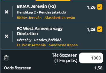 - BKMA – Alashkert: Az Alashkert az egyik legismertebb klub Örményországban, amely az elmúlt években több sikert is elért a hazai bajnokságban és kupákban. A gárda több bajnokságot is nyert már, rendszeres európai kuparésztvevő. Most nincs a legjobb formában, de még csak nyolc meccs telt el a bajnokságból. A csapat általában stabil védekezésre és gyors kontratámadásokra épít, különösen az európai kupasorozatokban, ahol gyakran szembesül erősebb ellenfelekkel. Viszont most gyengék eddig, nyolc meccsből hat pont a mérleg, csak egy győzelem, ideje lenne feltámadni. A BKMA, azaz a Jereváni Katonai Sport Klub, egy örmény labdarúgócsapat, amely a fővárosban, Jerevánban található. A csapat az örmény Premier League-ben, az ország legmagasabb szintű bajnokságában játszik, és története során fontos szerepet játszott az örmény futballban. A BKMA-t eredetileg a szovjet időkben alapították, amikor a katonai csapatok szerepe jelentős volt a sportéletben. A klub hosszú története során sokszor átszerveződött és újraindult. A klub hagyományaihoz hűen próbál erős, fizikai futballt játszani, amely illeszkedik a katonai sportegyesület múltjához. Jelenleg stabil középcsapat, amely a nála erősebb csapatok ellen szenved, a tőle gyengébbeket megveri. Az eddig mutatott játék alapján a BKMA az esélyesebb, de az Alashkert jobb játékosállománnyal bír, ideje lenne már kicsit feltámadni. Kis hendikeppel nyeretem a BKMA-t.