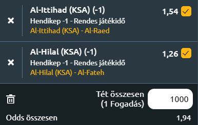 - Al-Hilal - Al Fateh: Al-Hilal kimagasló formájának és hazai dominanciájának köszönhetően egyértelmű esélyese a mérkőzésnek Al Fateh ellen. A címvédő csapat a legutóbbi 5-0-s győzelmével visszavette a tabella vezetését, és a szezonban eddig mindössze egy vereséget szenvedett el. A hazai pályán veretlen Al-Hilal minden mérkőzését megnyerte a Kingdom Arenában, miközben támadósoruk és védekezésük is kiemelkedő. Ezzel szemben Al Fateh súlyos válságban van, hiszen 13 meccse nyeretlen, az edzőváltások sem hoztak eredményt, és idegenben is a liga leggyengébb mérlegével rendelkeznek. Itt is -1 hendikepről is nyer a hazai csapat!