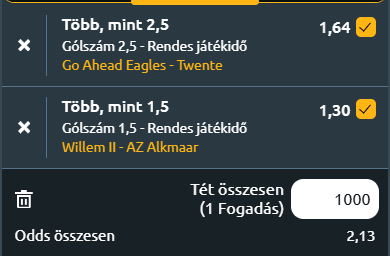 - Go Ahead Eagles - FC Twente: A Go Ahead Eagles remek formában van, hiszen ötmérkőzéses győzelmi sorozattal érkezik a találkozóra, és hét meccse veretlen minden sorozatot figyelembe véve. Paul Simonis csapata a szezon eddigi leghosszabb veretlenségi szériáját futja a bajnokságban, miközben magabiztosan halad afelé, hogy túlszárnyalja a tavalyi 43 pontos teljesítményét. Bár az Eagles az előző fordulóban legyőzte aktuális ellenfelét a kupában, a bajnokságban utoljára épp a Twente otthonában kapott ki december elején (3-2). Most azonban a hazai pálya előnyét élvezhetik, ahol zsinórban négy győzelmet arattak, és az utóbbi öt hazai találkozójukon mindig legalább kétszer betaláltak. A Twente is önbizalommal érkezik a mérkőzésre, miután fontos győzelmeket arattak a Malmö és a Besiktas ellen az Európa-liga csoportkörének végén, így még életben tartották európai álmaikat. Ugyanakkor a bajnokságban visszaesett a teljesítményük, hiszen az utóbbi öt meccsből hármat elveszítettek, és különösen idegenben küszködnek: a legutóbbi három idegenbeli találkozójukat elvesztették, miközben kilenc gólt kaptak és csak kétszer találtak be. A hazai csapat jó formája és a vendégek idegenbeli gyengélkedése miatt kiegyenlített mérkőzésre van kilátás, ahol legalább három gólt várhat a nagyérdemű!