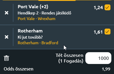 - Port Vale – Wrexham: Port Vale jó formában érkezik a mérkőzésre, hiszen az elmúlt öt találkozójukból hármat megnyertek és kettőt döntetlenre hoztak, ráadásul az előző fordulóban, hatékony támadójátékkal magabiztosan múlták felül a Doncaster Roverst. Otthon az utóbbi két meccsüket megnyerték, és korábban már sikerült kiejteniük Wrexhamet a sorozatból büntetőkkel. A Wrexham felemás formában van. Az elmúlt négy mérkőzésükből csak egyet nyertek meg, és idegenben különösen gyengén teljesítenek, az utóbbi kilenc idegenbeli meccsükből ötöt elveszítettek. Wrexham ráadásul védekezésben gyakorta hibázik, hiszen az elmúlt tíz meccséből csak egyszer tudott kapott gól nélkül lehozni egy találkozót. Bár a vendégek erősebb bajnokságban szerepelnek, a Port Vale remek formájában, hazai környezetben megfoghatja a vendégalakulatot. +2-es hendikeppel kell a hazaiak győzelmét rakni, ha nyerne is a Wrexham, az erősen csak egy gólos győzelem lesz. De sokkal nagyobb esély van a hazaiak eredményességére.