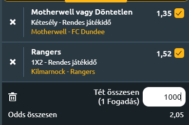 - Motherwell – Dundee: A Motherwell gyengélkedik. Michael Wimmer irányítása alatt még nem szereztek pontot, és már hat találkozó óta nyeretlenek, ötöt ráadásul zsinórban elveszítettek a skót élvonalban. A csapat az év elején még a felsőházi helyekért harcolt, de azóta visszacsúsztak a 10. helyre, mindössze négy ponttal a kiesést jelentő playoff-zóna fölé. Az új edzőnek gyorsan változtatnia kell a csapat teljesítményén, és a hazai pálya adhat egy kis lökést, hogy megszakítsák rossz sorozatukat. A Dundee a szezon eddigi részében gyengén szerepelt, és a 11. helyen állnak 27 ponttal. Az év eleji St Johnstone elleni győzelmük óta csak két pontot szereztek hat bajnokin, ráadásul két súlyos, 6-0-s vereséget is szenvedtek a Hearts és a Celtic ellen. Az Aberdeen elleni 2-1-es kudarc után legutóbb a Ross County ellen is kikaptak 3-1-re, pedig korán vezetést szereztek. A hazai csapat az új edző első otthoni mérkőzésén várhatóan extra motivációval lép pályára, és ezt kihasználva nem kapnak ki a mérkőzésen! X1