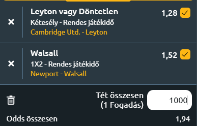 - Newport County – Walsall: A League Two hétfői játéknapján két hullámvölgyből igyekvő csapat csap össze: a bennmaradás küszöbén álló Newport County fogadja a feljutási reményeket még mindig tápláló Walsallt. Míg a hazaiaknak már csak néhány pont hiányzik a biztos bentmaradáshoz, addig a vendégek a playoffzónában vergődnek, és minden pontra szükségük van. A Newport szezonja hatalmas kilengéseket hozott. Az év eleji ötmérkőzéses vereségsorozat után sikerült egy ideig stabilizálni a formájukat, de azóta ismét visszazuhantak: az utóbbi 12 meccsükből csupán kettőt tudtak megnyerni, összesen nyolc pontot gyűjtöttek 36-ból. A gólínség a legfőbb gond – február közepe óta 13 meccsből nyolcon képtelenek voltak betalálni, és összességében is csak hat csapat szerzett náluk kevesebb gólt, miközben a legtöbb gólt kapták a ligában (70). A Walsall sem remekel mostanában: az utolsó 10 meccsükön csupán hat pontot szereztek, és legutóbb is csak egy utolsó perces góllal mentettek pontot a Harrogate ellen (2–2). Pedig egy ideig úgy tűnt, hogy akár a bajnoki címért is harcolhatnak. Most a 4. helyen állnak, három ponttal lemaradva az éllovas Port Vale mögött, így minden meccs fontos számukra a végjátékban. A támadósoruk kiváló, a 74 lőtt gól a liga legjobb mutatója, viszont a védekezésük gyenge, hiszen 53 gólt kaptak, ami kiugróan rossz mutató a feljutásra pályázók között. Ez a kettősség miatt gyakran gólgazdag, de kiegyensúlyozatlan meccseket játszanak. A Walsall sebezhető hátul, de sokkal veszélyesebb támadásban, és mivel számukra csak a győzelem az elfogadható, várhatóan ők diktálják majd a tempót. Egy szoros meccsen, de a vendégek sikerére van nagyobb esély.