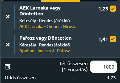 - AEK Larnaka – Omonia Nicosia: AEK Larnaca és Omonia Nicosia összecsapása során két veretlen csapat feszül egymásnak az AEK Arénában, ahol a statisztikák szoros, de gólokban sem szűkölködő találkozót vetítenek előre. Az AEK Larnaca magabiztos formában várja a kupameccset, hiszen az APOEL elleni 3–0-s győzelemmel hangolt a döntőre, és a Ciprusi Kupában eddig veretlen: három győzelem és egy döntetlen mellett 4 gólos meccsátlagot produkált úgy, hogy még gólt sem kapott. Bár az elmúlt öt találkozóján csak egyszer nyert, három döntetlen és egy vereség mellett is pozitív a mérlege: 1,2-es gólátlag mellett csupán 0,8-at engedett az ellenfeleknek. Az Omonia Nicosia szintén jó passzban van, legutóbb 1–0-ra győzte le az Apollont, a kupában pedig két győzelem mellett egy döntetlent ért el, miközben meccsenként átlagosan 3,33 gólt szerzett, kapott gól nélkül. Az elmúlt öt mérkőzésén szintén veretlen maradt (2 győzelem, 3 döntetlen), miközben csupán 0,4 gólt engedett meccsenként, védelme tehát stabilabbnak tűnik, mint ellenfeléé. Fej-fej mellett haladnak a kupasorozatban is, hiszen az AEK az első, az Omonia pedig a második helyen áll jelenleg. Az előzetes esélyek alapján az AEK Larnaca kicsivel esélyesebb, de a döntetlen is vastagon benne van a meccsben! 1X a tipp.