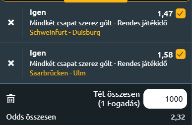 - Saarbrücken – Ulm: Szintén a Bundesliga 3-ban a második helyen álló Saarbrücken a középmezőnyben tanyázó Ulmot fogadja. A hazai pályán szereplő Saarbrücken kiváló formát mutat, hiszen eddigi öt bajnokijából hármat megnyert, egyet döntetlenre hozott és csak egyszer szenvedett vereséget, amivel a tabella második helyén áll. A csapat támadójátéka kifejezetten hatékony, mérkőzésenként átlagosan 2,4 gólt szereznek, de a védekezésben is stabilnak mondhatók, bár átlagosan 1,6 találatot kaptak. Legutóbb idegenben 3-1-re győzték le a Stuttgart II-t, ami tovább növelte önbizalmukat. Az Ulm eddig hullámzó teljesítményt nyújtott a bajnokságban, két győzelem mellett három vereség szerepel a nevük mellett, így jelenleg a 12. helyet foglalják el. A gólátlaguk 1,4 szerzett és 1,6 kapott gól, ami kiegyensúlyozott, de nem kiemelkedő mutató. Legutóbb azonban 3-1-re diadalmaskodtak az Alemannia Aachen otthonában. Komoly esély mutatkozik arra, hogy mindkét csapat betaláljon, amit alátámaszt az is, hogy mindkét együttes legutóbbi 10 mérkőzéséből hétszer fordult elő gólváltás.