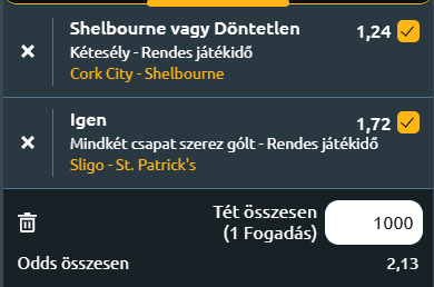 - Cork City – Shelbourne: Az ír bajnokságban a kiesés elkerüléséért küzdő Cork City és a tavalyi bajnok Shelbourne találkozik. A vendégek a nemzetközi kupaindulásért küzdenek, a hazaiak egyre kilátástalanabb helyzetbe kerülnek a tabella alján. A Shelbourne idén nem valószínű, hogy megvédi bajnoki címét, hiszen jelentős a lemaradása az éllovas Shamrock Rovers mögött, ám a dobogós helyekért folytatott harcban még bőven versenyben van. Damien Duff csapata jelenleg hatodik, de a második és hatodik hely között mindössze három pont a különbség, így egy ilyen kedvezőnek tűnő mérkőzés akár visszarepítheti őket az európai indulást érő pozíciókba. Az előző héten a sereghajtó Sligo Rovers ellen egy szoros 3-2-es győzelemmel éltek is a lehetőséggel, de idegenben mostanában nem megy nekik jól és ez óvatosságra int a fogadással kapcsolatban! Az utóbbi öt vendégszereplésükön nyeretlenek, és a két legutóbbit elveszítették. A hazai Cork City viszont sokkal gyengébb formát mutat és nagyon nehéz helyzetben van. Csupán 12 pontot gyűjtöttek 17 meccsen, és máris 10 pont a hátrányuk a bennmaradó helyen álló Waterford mögött. A formájuk siralmas, négy egymást követő vereségnél tartanak, bár minden meccsen betaláltak, ám a gyenge védekezés rendre lenullázza ezt az előnyt. Az sem segít, hogy a vezetés birtokában is gyakran összeomlanak, ahogyan azt a St Patrick's és a Drogheda elleni meccseken is láthattuk. A papírforma alapján a motivált és versenyben lévő Shelbourne minősége elég lehet a három pont begyűjtéséhez, de legalábbis nem kapnak ki! X2 a tipp.