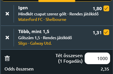 - Sligo Rovers - Galway United: A kiesés elől menekülő Sligo Rovers hétfő este a Showgroundsban fogadja a lendületbe jövő Galway Unitedet. A Sligo nincs olyan rossz formában, az utóbbi öt hazai meccsből csak kettőt veszítettek el, de ez nem garancia a sikerre, különösen egy olyan Galway United ellen, amely zsinórban négy veretlen mérkőzésen van túl, közte egy 3–1-es győzelemmel az európai álmokat dédelgető St. Patrick’s ellen. A vendégek is remek formában vannak, 13 ponttal állnak a Sligo előtt, és egy újabb győzelemmel akár negyedik helyre is felléphetnek. Ugyanakkor Galway idegenbeli teljesítménye gyenge az elmúlt időszakban, öt meccse nyeretlenek, és alig szereztek gólt, így reális forgatókönyv lehet egy gólos döntetlen is, különösen, ha a Sligo kihasználja hazai pálya előnyét. Az esélyek kiegyenlítettek, de az előző meccshez hasonlóan gólokra itt is számíthatunk, legalább kettőre.