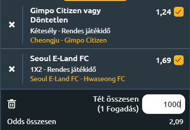 - Seoul E. - Hwaseong: A Seoul E., kiegyensúlyozott formát mutat a bajnokságban, jelenleg a K League 2 nyolcadik helyét foglalja el. Az idei szezonban 12 győzelmet, 8 vereséget és 12 döntetlent könyvelhetett el, ami stabil, de nem kiemelkedő teljesítményre utal. A gólmutatójuk azonban pozitív: meccsenként 1,47 gólt szereznek, miközben 1,28-at kapnak, ami a támadóerejük mellett viszonylag megbízható védekezésük van. Legutóbb idegenben 2–0-ra győzték le a Seongnamot, ami önbizalomnövelő siker volt a csapat számára. A Hwaseong, a K League 2 tizedik helyén áll, és hullámzó teljesítménnyel szerepel a szezon során. Eddig 8 győzelmet, 13 vereséget és 11 döntetlent jegyeztek, ami a középmezőny alsó felébe sorolja őket. A csapat átlagosan 0,97 gólt szerez meccsenként, miközben 1,22 gólt kap, tehát a támadójáték gyenge hatékonysága és a védelem sebezhetősége is problémát jelent. Legutóbbi találkozójukon 1–0-s vereséget szenvedtek az Incheon United ellen, ami tovább rontotta formájukat. A számok és az eddigi teljesítmények alapján Seoul E. egyértelműen esélyesebb a mérkőzésen. A hazaiak stabilabbak, kiegyensúlyozottabbak, és hatékonyabban védekeznek, mint riválisuk. Emellett az egymás elleni mérleg is őket támogatja, hiszen a Hwaseong még nem tudta legyőzni őket, és gólt sem szerzett ellenük az elmúlt három találkozón.