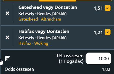 - Gateshead – Altrincham: Az angol National League-ben a hárommeccses veretlenségi sorozatát megőrizni kívánó Gateshead az idegenbeli első sikerére hajtó Altrincham csapatát fogadja. A Gateshead a tavalyi szezonban kevéssel maradt le a rájátszásról, így idén céljuk a legjobb hét közé kerülés a National League-ben. Alun Armstrong együttese jelenleg a hetedik helyen áll, miután a hat forduló során három győzelmet, egy döntetlent és két vereséget könyvelhetett el. A csapat augusztus 20-án súlyos, 4-0-s vereséget szenvedett a Rochdale ellen, azóta azonban magára talált, hiszen legyőzte a Tamworth és a Yeovil Town gárdáját, majd hazai pályán döntetlent játszott az Aldershot Town ellen. Az Altrincham az előző idényt a kilencedik helyen zárta, mindössze négy ponttal lemaradva a rájátszást érő helyektől, és három ponttal a nyolcadik Gateshead mögött. A mostani szezonjuk azonban gyengén indult, hiszen hat mérkőzésből kettőt nyertek és négyet elveszítettek. A rajton legyőzték az Aldershot Townt, majd három egymást követő vereséget szenvedtek el, mielőtt hazai pályán 2-0-ra verték a Solihull Moorst. A hétvégi fordulóban idegenben szenvedtek vereséget az Eastleigh ellenében. A Gateshead jelenlegi formájában, hazai környezetben esélyesebb, három mérkőzés óta veretlen, és támadásban képes eredményesen játszani. A vendégek ezzel szemben idegenben továbbra sem tudtak pontot szerezni, sorozatban háromszor kaptak ki. Döntetlennél nem lesz rosszabb eredmény a hazaiak szempontjából! 1X