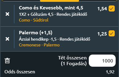 - Cremonese – Palermo: Szintén Coppa Italia első kör, ahol a frissen feljutott Cremonese a szicíliai Palermo csapatát fogadja. Mindkét együttes új edzővel és friss igazolásokkal készül a szezonra, így már a nyitómeccsen komoly erőpróba vár rájuk. A Cremonese a Spezia elleni emlékezetes párharcban kiharcolta a Serie A-ba való visszatérést. A feljutás után edzőváltás történt, Giovanni Stroppa helyét a Serie A-ban többször is sikeresen bennmaradást kiharcoló Davide Nicola vette át. A nyári felkészülés során 0–0-s döntetlennel zártak a Reggiana ellen, és több új játékossal erősítettek, köztük Giuseppe Pezzellával, Alberto Grassival, Marco Silvestrivel és Federico Baschirottóval. Emellett az AC Milan két kölcsönjátékosa, Warren Bondo és Filippo Terracciano is csatlakozott. A Palermo az elmúlt években hosszú utat járt be: az egykori európai kupaszereplő csapat a pénzügyi csőd után a Serie D-ből indult újra, majd 2022-ben a City Football Group tulajdonába került. Azóta háromszor is az élmezőnyben végzett a Serie B-ben, bár a feljutás eddig elmaradt. A tavalyi szezon playoff-kudarcát követően Alessio Dionisi helyét Filippo Inzaghi vette át, aki hat győzelemmel kezdte a felkészülést, majd a Manchester City elleni vereséggel zárták a nyarat. A két gárda tavaly mindössze kilenc ponttal végzett egymás mögött a Serie B-ben, így papíron kiegyenlített mérkőzés várható. Ugyanakkor a Palermo nyári átigazolási politikája kifejezetten erős volt, és a keretük bővült rutinos, Serie A-t is megjárt játékosokkal. A Cremonese figyelme már most a Milan elleni bajnokira terelődhet, ami csökkentheti a kupabeli koncentrációt, ez pedig könnyen a Palermo malmára hajthatja a vizet, és a szicíliaiak akár meglepetést is okozhatnak! +1,5-es hendikepről nyer a Palermo (vagyis egy góllal még kikaphat)!
