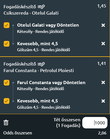- Farul Constanta – Petrolul: Szintén román bajnokság, ahol két tipikus középcsapat találkozik, de az egyik jobb formában van. AFarul hazai pályán fogadja a Petrolult. A Farul Constanța, jelenleg a bajnokság 9. helyén áll. Az eddigi szezonban három győzelmet, három vereséget és egy döntetlent könyvelhetett el, miközben mérkőzésenként átlagosan 1,29 gólt szerzett és ugyanennyit is kapott. Legutóbb idegenben győztek a Corvinul Hunedoara ellen 0–1 arányban, ami önbizalmat adhat számukra. Az egymás elleni meccsek tekintetében előnyben vannak, a legutóbbi egymás elleni találkozón idegenben 0–1-re nyertek a Petrolul ellen, az utolsó öt összecsapásukból pedig hármat is megnyertek, egy döntetlen és egy vereség mellett. A Petrolul jelenleg a 12. helyen áll a tabellán. A szezonban mindössze egy győzelmük van, három döntetlennel és három vereséggel kiegészítve a mérlegüket. Góllövésben gyengébben teljesítenek, hiszen átlagosan csak 0,86 gólt szereznek, miközben 1-et kapnak meccsenként. Legutóbbi mérkőzésükön döntetlent értek el a CSM Iaşi ellen 1–1-es eredménnyel. A támadási hatékonyság nagyon gyenge, az elmúlt öt mérkőzésüket figyelembe véve egyszer sem tudtak nyerni! A Farul Constanța előnyösebb helyzetben van a tabellán, több győzelmet aratott a szezonban, és közvetlen összehasonlításban is többször legyőzte a Petrolult. Ezen felül támadójátékuk hatékonyabb, mivel több gólt szereznek mérkőzésenként, így összességében jobb esélyekkel vágnak neki a találkozónak és döntetlennél rosszabb eredmény nem várható számukra. Mivel két szerényebb képességű román középcsapat találkozik, nem várható gólözön a mérkőzésen. Tipp: 1X + kevesebb, mint 4,5 gól!