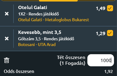 - Botoşani - UTA Arad: A két csapat a tabella felső felében helyezkedik el, és mindkettő stabil formát mutat a szezonban. A Botoşani jó hazai teljesítménye és erős védekezése miatt esélyesként várja a találkozót, ugyanakkor az UTA Arad masszív játéka kiegyenlített párharcot vetít előre. A Botoşani remek idényt fut, hiszen a Superliga negyedik helyén áll, 6 győzelemmel, 1 vereséggel és 4 döntetlennel. A csapat támadójátéka hatékony, átlagosan 2 gólt szerez mérkőzésenként, miközben védekezése is stabil, hiszen csak 0,91-es kapottgól-átlagot mutat. Az elmúlt öt mérkőzésük kimagasló formát jelez: négy győzelem és egy döntetlen a mérlegük, miközben mindössze 0,4 gólt kaptak meccsenként. Legutóbb a Metaloglobust győzték le idegenben 2–0-ra, ami tovább erősítette önbizalmukat. A csapat kiegyensúlyozott játéka, fegyelmezett védekezése alapján különösen hazai környezetben előnyben van. UTA Arad jelenleg a tabella hetedik helyét foglalja el, mérlege 3 győzelem, 1 vereség és 7 döntetlen. Ez a sok döntetlen jól mutatja a csapat óvatos, taktikus játékstílusát, amely elsősorban a szervezett védekezésre épül. Átlagosan 1,36 gólt szereznek és 1,27-et kapnak mérkőzésenként, ami kiegyenlített teljesítményre utal. Az utóbbi öt meccsükön egy győzelem, egy vereség és három döntetlen a mérlegük, meccsenként 1,2 szerzett és ugyanennyi kapott góllal. Legutóbb a Csíkszereda ellen gól nélküli döntetlent játszottak, ami ismét megmutatta, hogy stabilan védekeznek, de támadásban kevésbé hatékonyak. A statisztikai mutatók mindkét csapat esetében erős védekezést és fegyelmezett játékot jeleznek, ami alapján nem várható gólzáporos mérkőzés. A találkozón maximum három gólt várhatunk!