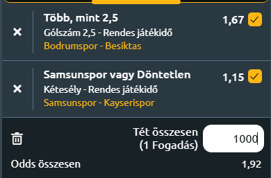 - Samsunspor - Kayserispor: Az előző meccsel ellentétben téttel bíró meccs vár a Samsunspor csapatára, amikor hazai pályán fogadják a remek formában záró Kayserisport. Egy győzelem ugyanis garantálná a klub első nemzetközi kupaszereplését az UEFA Európa Ligában! A Samsunspor hihetetlen idényt fut második élvonalbeli szezonjában, és a harmadik hely megszerzése hatalmas áttörést jelentene a klub történetében, mind sportszakmai, mind anyagi szempontból. Thomas Reis együttese már így is klubrekordot döntött a legjobb élvonalbeli szerepléssel, de ha sikerül győzniük, akkor nemcsak megőrzik helyüket a tabella élbolyában, hanem elkerülik az Európa-liga korai selejtezőit, ami jelentősen növeli esélyeiket a csoportkörös szereplésre is. A Besiktas még veszélyt jelent a helyezésükre, az isztambuliak csak akkor előzhetnek, ha ők nyernek Bodrumban, és közben Samsun nem győz. A hazaiak jó formában várják a meccset: a Trabzon elleni döntetlen előtt három győzelmet arattak, és a nyomás sem bénítja őket. Azonban Kayserispor sem könnyű ellenfél, vendégként gyenge mérleget hoznak, de otthon erősek. Sergej Jakirovic csapata ráadásul március óta csak a Galatától kapott ki, így ma a hatalmas tét és az esélyesség ellenére sem érdemes fix hazai-t rakni, hanem a döntetlent is figyelembe kell venni. Tipp: 1X