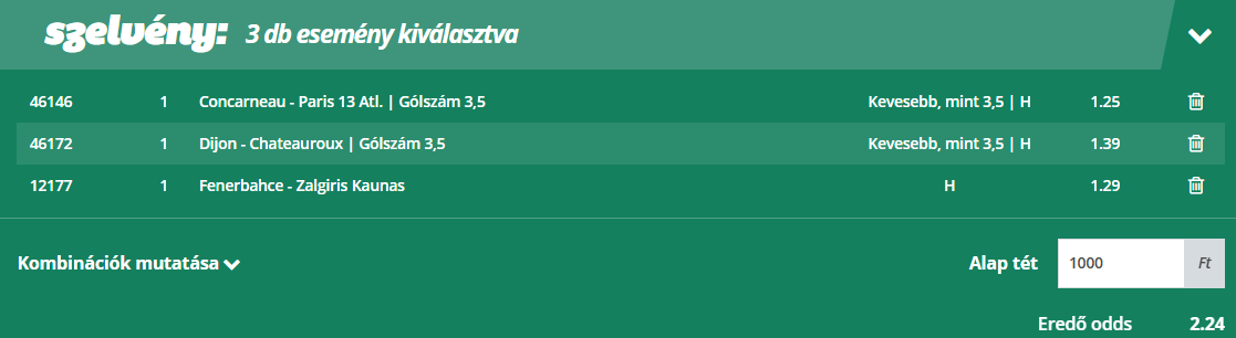 Concarneau-Paris 13 AC & Dijon-Chateauroux & Fenerbahce-Zalgiris Kaunas (Euroliga) Kevesebb, mint 3,5 gól a meccsen + Kevesebb, mint 3,5 gól a meccsen + Fenerbahce nyer | 2.24 | (7/10)