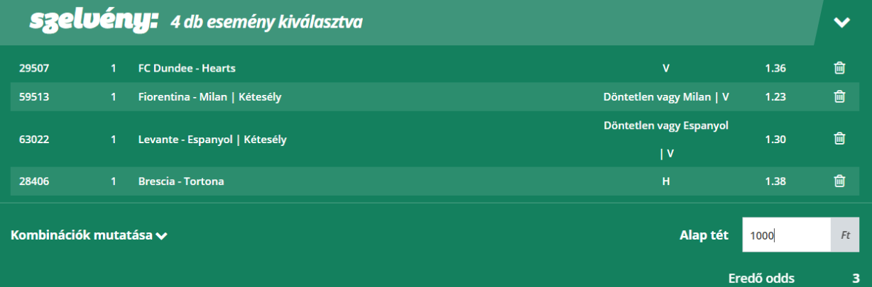 Az olvasók kedvenc rovatában vegyes szelvényeket próbálunk összehozni, amelyben két-három mérkőzést kombinálunk majd egy ajánlatba. Az eredő szorzó 3,2 és 3,9 között van a meccskínálat függvényében. Ezek a szelvények kiválóan alkalmasak Fibonacci stratégiára, bankrollmenedzsmenttel kombinálva. Fosszuk ki az irodákat együtt!