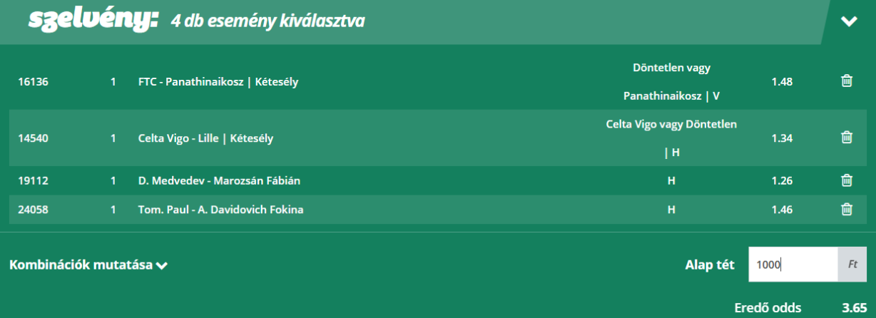 Az olvasók kedvenc rovatában vegyes szelvényeket próbálunk összehozni, amelyben két-három mérkőzést kombinálunk majd egy ajánlatba. Az eredő szorzó 3,2 és 3,9 között van a meccskínálat függvényében. Ezek a szelvények kiválóan alkalmasak Fibonacci stratégiára, bankrollmenedzsmenttel kombinálva. Fosszuk ki az irodákat együtt!