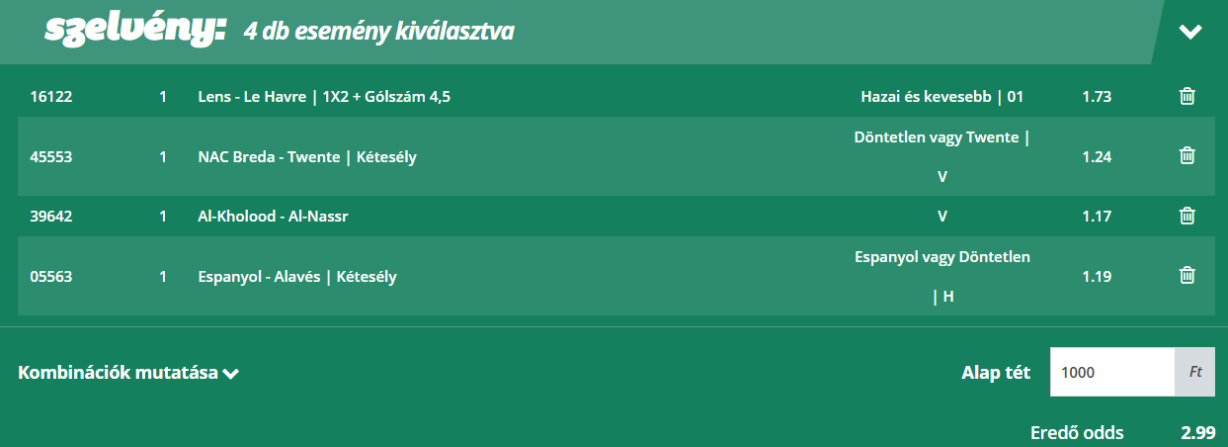 Az olvasók kedvenc rovatában vegyes szelvényeket próbálunk összehozni, amelyben két-három mérkőzést kombinálunk majd egy ajánlatba. Az eredő szorzó 3,2 és 3,9 között van a meccskínálat függvényében. Ezek a szelvények kiválóan alkalmasak Fibonacci stratégiára, bankrollmenedzsmenttel kombinálva. Fosszuk ki az irodákat együtt!