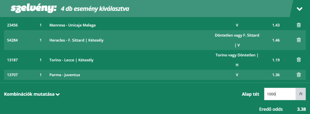 Az olvasók kedvenc rovatában vegyes szelvényeket próbálunk összehozni, amelyben két-három mérkőzést kombinálunk majd egy ajánlatba. Az eredő szorzó 3,2 és 3,9 között van a meccskínálat függvényében. Ezek a szelvények kiválóan alkalmasak Fibonacci stratégiára, bankrollmenedzsmenttel kombinálva. Fosszuk ki az irodákat együtt!