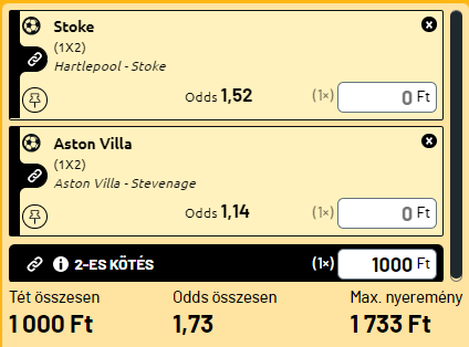 - A Liga 2-es Hartlepoolnak nincs vesztenivalója, amikor nekivág a kupameccsnek a Championship ellenféllel szemben. A Stoke alapvetően is esélyesebb, és mivel Gayle visszatérhet erre a meccsre, fokozott minőségi különbség van a két csapat között. A Stoke idegenben is legyőzi negyedosztályú ellenfelét!