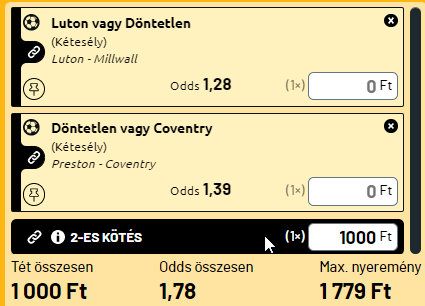 - Mindkét csapat magabiztos lesz abban, hogy folytatja biztató formáját, amikor pályára lép a Deepdale-ben. Azonban a Coventry győzelmi szériája és a Preston gyenge teljesítménye miatt ez inkább a vendégsiker felé hajlik. A X2 esélyre remek szorzó van.