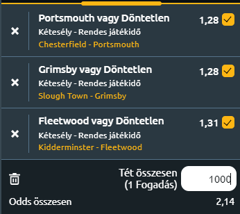 Chesterfield – Portsmouth: A National League listavezető Chesterfield a League One listavezető Portsmouth-t fogadja az SMH Group Stadiumban az FA-kupa első fordulójának egyik kiemelkedő mérkőzésén. Mindkét csapat kiváló formában van, és az idei szezonban a saját osztályukban a feljutás nagy esélyesei közé tartoznak. A Chesterfieldtől nem idegen, hogy ördögien nehéz FA-kupa-meccseket kapjon, és most is kaptak egy ilyet. Nagyon komoly különbségek vannak, itt sima vendégsiker teljesen reális. A szelvény zöldülésének érdekében a döntetlent is figyelembe veszem. X2 a tipp.