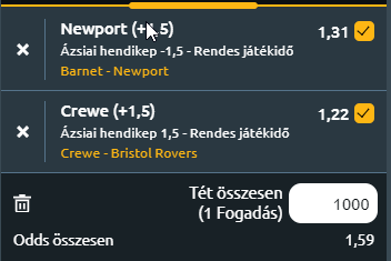 - Crewe Alexandra - Bristol Rovers: A Crewe Alexandra és a Bristol Rovers ma este az FA-kupában találkozik, a két csapat számára a harmadik fordulóban való részvétel a tét. A két csapat eredetileg december 2-án meccselt volna egymással, de a Gresty Roadon megrendezett mérkőzést el kellett halasztani a pálya fagyása miatt. A Crewe az idei szezonban az FA-kupa első fordulójában lenyűgöző skalpot szerzett, miután a november elején rendezett első mérkőzésen 2-2-es döntetlent játszottak, és a visszavágón 3-1-re legyőzték a Derby Countyt. Ez minden bizonnyal komoly lendületet ad ma nekik! Alapvetően a Bristol Rovers továbbjutása az esélyesebb, de a Crewe hazai környezetben meglepheti az ellenfelet és nagyon szorossá teszi a mérkőzést. Itt is a +1,5-es hendikepet alkalmazom, csak ezúttal a hazaiakra.