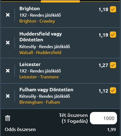 - Brighton - Crawley Town: Itt ismét többemeletes különbség van! A Brighton legutóbb a Manchester United ellen aratott győzelmet, de a League One-ban szereplő vendégek is jó formában vannak, hiszen eddig ötből négy meccset nyertek meg. Még egy rotált Brightonnak is kényelmesen le kellene, hogy győzze az előző szezonban még a Liga 2-ben játszó ellenfelet, hiszen a Brighton csapatának mélysége igencsak komoly szint. HAZAI