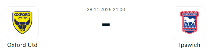 - Az Ipswich kiváló formában van, célja a feljutás! A gárda négy győzelemmel és két döntetlennel építette fel újra magát az októberi két vereséget követően, és ennek köszönhetően a tabella ötödik helyén áll. A válogatott meccsek miatti szünet után egy gól nélküli döntetlennel indítottak Wrexham ellen, majd Hull Cityben gyors egymásutánban talált be Nunez és Akpom, amivel 2–0-s idegenbeli sikert arattak. Csupán három pont választja el őket a feljutó pozícióktól, ez komoly motivációt ad a vendégeknek, akik most arra készülnek, hogy 1997 óta először nyerjenek Oxfordban. Bár több játékosuk hiányzik, de a keret mélysége lehetővé teszi, hogy továbbra is ütőképesek maradjanak. Akpom mellett Philogene, Walle Egeli vagy Taylor is kezdőként kaphat szerepet.