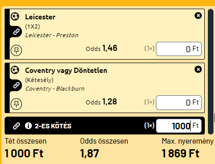 - Coventry – Blackburn: A Coventry City szerda este a Blackburn Roverst fogadja, mindkét klub a Championship tabellájának alsó felében foglal helyet. Míg a hazaiak nemrég a 15. helyre léptek előre, addig a vendégek három egymást követő vereséget elszenvedve a 18. helyen állnak. A Coventrytől távozott Gustavo Hamer és Viktor Gyokeres, ez sokkal jobban meglepte az amúgy tavaly remekül teljesítő csapatot. Mark Robbins edző nem számított arra, hogy szezon elején nyolc mérkőzésen mindössze egyetlen győzelem kerül a zsákba, de ez történt és azóta is csak lassú feleszmélés történik. De ma verhető csapat érkezik. A Blackburn kiszámíthatatlan csapat és jelenleg sorozatos vereségeket szenved. Benne van az, hogy a legutóbb győzelmet arató Coventry hazai pályán lendületből megveri a Blackburnt is, de az X is benne van!