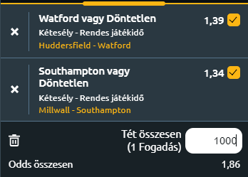 - Millwall – Southamtpon: A Southampton szombat délután a Millwall ellen lép pályára, a The Denben, hogy meghosszabbítsa a Championshipben a közelmúltban elért veretlenségi sorozatát. Miközben a Szentek a negyedik helyen állnak a tabellán és rég nem látott jó formának örvendenek, a Millwall csak a 18. helyen áll, mivel az elmúlt négy mérkőzéséből egyet sem tudott megnyerni. Érdekesség, hogy a Southampton továbbra is negatív gólkülönbséggel áll, ami ritka egy negyedik helyen álló csapatnál. Bár a Millwall otthon bármelyik másodosztályú ellenféllel szemben képes felborítani az esélyeket, a Southampton egyértelmű favoritja ennek a találkozónak. A vendégsiker mellett a döntetlent lehet még figyelembe venni a mai meccs kapcsán. Itt is X2 a tipp.