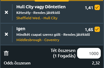 - A Hull a mérkőzés esélyese, bár a Sheffield Wed okozhat gondokat amikor a saját stadionjában játszik. A döntetlen mellett a vendégsikert vehetjük figyelembe.