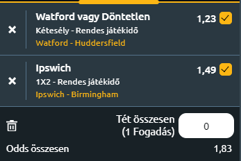- Watford - Huddersfield Town: A Watford a 11. helyen áll a Ligabajnokságban, a Huddersfield a 20. és pontosan 10 pont különbség van közöttük. A Watfordnak ma győznie kell ahhoz, hogy versenyben maradjon a Playoff-helyek valamelyikéért, ez pedig a minimális cél volt korábban! Nem lesz könnyű, mert a vendégek javuló formát mutatva utaznak a Vicarage Roadra. Ismael mester, aki csaaptával legutóbb végre visszatalált a helyes útra, bízik abban, hogy sikerül ma is nyernie, de a döntetlen is benne lehet a mai meccsben. 1X a tipp