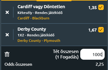 - Cardiff City - Blackburn Rovers: A Cardiff hatmeccses veretlenségi sorozat végén utazott legutóbb a Luton Town otthonába. Az idegenbeli győzelemben reménykedő walesi alakulat végül kikapott, bár szoros mérkőzés volt, de a Luton 1-0-ra győzni tudott, Jacob Brown második félidőben szerzett gólja jelentette a különbséget. A Blackburn az idény elején feljutási álmokat dédelgetett, de aztán ezek az álmok elillantak, mert elég gyengén muzsikál az együttes. Jelenleg a legutóbbi hét mérkőzésükből ötöt elveszítettek, ráadásul három meccs telt el úgy, hogy a hazai pályán nem tudtak pontot szerezni. A Sheffield United és a Stoke City ellen szenvedtek 2-0-s vereséget, míg Eustace csapata az utóbbi négy mérkőzésén nem talált be. A Cardiff lendülete várhatóan megmarad és hazai környezetben még mélyebbre taszítja a Blackburn csapatát.