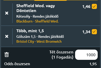 - Bristol City - West Bromwich Albion: Ezen a mérkőzésen két playoffért harcoló csapat csap össze, ám eltérő formában vannak. A hazaiak jó formát mutatnak, az elmúlt kilenc bajnokijukból csak a listavezető Burnley ellen kaptak ki, és a hétvégén a közvetlen rivális Watford ellen már fél óra alatt eldöntötték a meccset. Ez a győzelem azt is eredményezte, hogy a Bristol City feljött a hatodik helyre, megelőzve a szintén esélyes Coventryt, és három ponttal megelőzve a mostani vendég West Bromot. Liam Manning csapata kiváló hazai formát mutat, 20 hazai meccsen 39 pontot gyűjtött, Anis Mehmeti révén támadásban is hatékonyabbak lettek 2024-25-ben. Ezzel szemben a West Brom komoly gödörben van, mindössze egy győzelmet arattak az elmúlt hat bajnokijukon. Nagyon erős a keret és rengeteg helyzetet kidolgoznak, de különösen Josh Maja hiányában nem tudják gólra váltani ezeket. A kulcsjátékosok többsége gyenge formában van, így összességében a WBA nem hatékony az utóbbi időben. A Bristol City jó hazai formájával talán kicsit esélyesebb, de a WBA nagyon erős csapat, hiába vannak rossz formában, óvatosan kell ellenük fogadni. Maradnék inkább a góloknál, amiből legalább kettőt várhatunk.