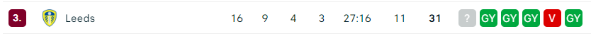 - A Leeds 31 ponttal a harmadik helyen áll a tabellán, fő célja a Premier Ligába kerülés az idei szezonban, erre pedig reális esélyük is van. Viszont az első két helyért való küzdelemben most még 8 pontos hátránnyal bírnak a Leicester és az Ipswich mögött, több bukást nem nagyon engedhet meg magának a Leeds! A leeds-i játékosok jó formában vannak, az utolsó öt mérkőzésükön négy győzelmet szereztek (a Norwich ellen 3:2-re, a Huddersfield ellen 4:1-re, a Leicester ellen 1:0-ra és a Plymouth ellen 2:1-re), és csak egy vereséget szenvedtek el a Stoke ellen idegenben 1:0-ra. Ma a liga egyik leggyengébb csapatával szemben kell ezt a sorozatot folytatni és erre megvan minden esélye Daniel Farke fiainak!
