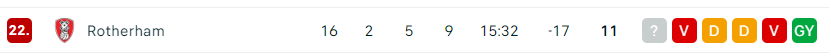 - A Rotherham nehezen kezdte a szezont, és tizenhat mérkőzés után a kieső zónában helyezkedik el, csupán a 22. helyet tudhatja magáénak, mindössze 22 pontot szerezve. Már négy pont a hátrányuk a Huddersfielddel szemben, ami azt jelzi, hogy ha nem javul hamarosan a formájuk, akkor alighanem lezuhannak a League One bugyrába. Legutóbbi győzelmüket már egy hónapja aratták, akkor a Coventry ellen 2:0 arányban tudtak nyerni. Azóta csak két pontot sikerült szerezniük a QPR és az Ipswich elleni döntetlenekből. Vereséget szenvedtek a Sheffield Wednesday ellen (2:0), a legutóbbi fordulóban pedig a Watfordtól szenvedtek súlyos, 5:0 arányú vereséget. A válogatott miatti szünet jókor jött számukra, de ennek ellenére ma egy olyan erős gárda érkezik, amely ellen nagyon nehéz lesz még csak egy pontot is szerezni!