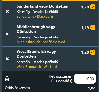 - Middlesbrough - Sheffield Wednesday: Bár a két csapat között lévő pontkülönbség alapján a Middlesbrough a favorit, a mérkőzésnek mégis kemény küzdelem lehet a vége. A Middlesbrough az utóbbi időben jó formában van, öt meccses veretlenségi sorozatot tartva, és ez a teljesítménynövekedés arra enged következtetni, hogy ma is nyerhetnek a hazaiak. A Sheffield Wednesday küzd a kiesés elkerülése érdekében, de az utóbbi három mérkőzésükön nem tudtak győzni, és a közelmúltban kapott gólok száma is arra utal, hogy nehéz dolga lesz ma a Baglyoknak. Küzdelmes, harcos meccset várok, de a vendégek szempontjából maximum egy döntetlent tudok elkpzelni. 1X a tipp.
