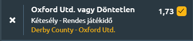 Egy Single Value Tipp következik, vagyis a sportfogadásban egy olyan értékelhető szorzó, amely single játékba küldés esetén is értéket hordoz magában! A Derby County és az Oxford United találkozóján két-, gyengébb formát mutató csapat találkozik. A Derby legutóbb döntetlent ért el a Norwich ellen, ezzel megtörve nyolcmeccses vereségi sorozatát, de továbbra is rengeteg gondjuk van a támadójátékkal. Az Oxford ugyan kevés gólt szerez, de az utóbbi időben stabilabb idegenbeli teljesítményt mutatott, ami kulcsfontosságú lehet ezen a találkozón.