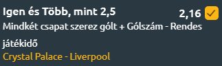 Mivel szerintünk a Liverpool Salah, Wirtz, Gakpo, Ekitiké vezérletével erőteljes támadóarzenállal rendelkezik, ezért szerintünk ez lehet a katalizátora lenti sikeres tippünknek. A Palace-nál Eze és Mateta okozhatnak majd veszélyt, előbbi elsősorban Frimpong megüresedett helyét célozhatja meg, amennyiben a Liverpool középpályásai nem tudják hatékonyan levédekezni a holland mögötti területeket.
