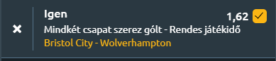 - A Bristol City otthoni jó formája és erős védekezése alapján reális esélyük van arra, hogy legyőzzék a Premier League-ben küszködő Wolverhamptont. A Wolves védekezése sérülékenynek tűnik, különösen idegenben, ezáltal van esély arra, hogy a hazaiak betalálnak. A vendégek tapasztalata és támadóképessége miatt tőlük is várható gól, ráadásul a forma ellenére, van minőség a csapatban. Döntetlen-körüli eredmény és gólváltás várható.