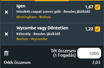 - Birmingham City – Bolton: A Birmingham City két pont előnnyel áll az élen, miután 10 mérkőzésükből nyolcat megnyertek, egy döntetlent játszottak, és csupán egyet veszítettek el. Chris Davies csapata hét mérkőzéses győzelmi sorozatot tudhatott magáénak, mielőtt a Charlton Athletic ellen 1-0-ra elveszítették volna az away meccset. A csapat azonban a legutóbbi, Lincoln City elleni idegenbeli mérkőzésen 3-1-es győzelmet aratott, még úgy is, hogy a mérkőzés első percében gólt kaptak. Keshi Anderson duplázott, míg Willum Willumsson egy gólt szerzett, biztosítva, hogy a Birmingham idén már négy győzelmet arattak az öt idegenbeli ligamérkőzésükből. A Bolton nehezen kezdte a 2024-25-ös szezont, miután a legutóbbi playoff döntőjükben elszenvedett vereség után az első öt mérkőzésükből mindössze egy győzelmet, egy döntetlent és három vereséget könyvelhettek el. Azonban az utóbbi időszakban feljavult a teljesítményük, hiszen az utolsó öt mérkőzésükből négyet megnyertek (1 döntetlen), beleértve a legutóbbi, Shrewsbury Town ellen aratott 2-1-es hazai győzelmüket. Aaron Collins és Randell Williams egy-egy gólt szereztek a mérkőzésen, így a Bolton a 11. helyre lépett előre, csupán egy pontra a playoff helyezésektől. A Birmingham az esélyesebb a meccsen, hiszen eddig 25 pontot gyűjtöttek a lehetséges 30-ból a harmadik ligában, míg a Bolton ugyan szintén nem tudott vesztesen távozni az utolsó öt meccsükből, így gólra ők is jók lesznek! MINDKÉT CSAPAT GÓL