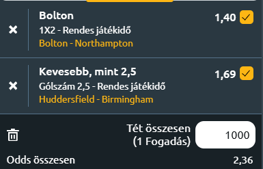 - Huddersfield Town - Birmingham City: A közelmúltban mindkét csapat leginkább alacsony gólszámú találkozókat játszott, és erősségeik inkább a védekezésben rejlenek. A Bolton legutóbbi mérkőzésén például egyetlen Aaron Collins-góllal tudott nyerni Huddersfield ellen és a védelmük remekelt! A Northampton szintén defenzív játékot játszik Kevin Nolan irányítása alatt, amit a Wycombe elleni 0-0-s döntetlen is jól mutat, ahol hatékonyan korlátozták az ellenfél helyzetkialakításait. A vendégek védelme erős, de támadójátéka különösen gyenge, hiszen ők a liga legkevesebb gólt szerző csapata, és kilenc mérkőzés óta nem szereztek egynél több találatot. Mindezek alapján egy alacsony gólszámú, taktikai küzdelem várható.