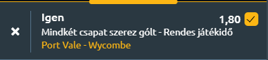 - A kiesés fenyegeti a Port Vale-t, amely minden egyes vereség és pontvesztés után egy kicsit veszít abból a reményből, hogy megúszhatják! Ma egy középcsapat érkezik hazai pályára. A házigazdák a 21. helyen tanyáznak a League One tabelláján, míg a Wycombe a 14. helyen áll a tabellán. A Wycombe legutóbbi két idegenbeli mérkőzését megnyerte a Vale Parkban, és ma is ők az esélyesek a Port Vale ellen, amely az előző négy mérkőzéséből hármat elveszített. De azért küzdeni fognak, feladni nem fogják és ez gólt ér majd! Mindkét oldal betalál ma!