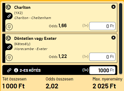 Az olvasók kedvenc rovatában 2,0 és 3,0 közötti szelvényeket próbálunk összehozni, amelyben két-három mérkőzést kombinálunk majd egy ajánlatba. Az eredő szorzó 1,8 ás 2,2 között lehet, a meccskínálat függvényében. A cél, hogy minél alacsonyabb kockázati tényezővel lehessen játékba küldeni a szelvényt akár papíros változatban, akár a neten. Fosszuk ki az irodákat együtt! Ma az angol negyedik vonalból hoztam egy duplát!