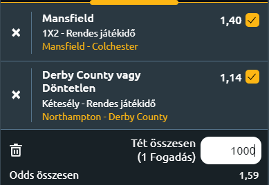 - Northampton Town - Derby County: A Northampton a februárt egy hármas veretlenségi sorozattal zárta, de ebben a hónapban jelentősen romlott és az utolsó öt mérkőzéséből mindössze két pontot szerzett. Jon Brady csapata a Charlton Athletic és a Cambridge United elleni döntetlent játszott a Peterborough United elleni súlyos vereség mellett, majd a Blackpool és a Wycombe Wanderers elleni két vereséget szenvedett. A csapat langyosvíz, vagyis a középmezőnyben foglal helyet, esélyes, hogy a második szezonra is meghosszabbítják a League One-ban való tartózkodásukat. Ma nagyon jó támadási hatékonyságra lenne szükség, ha gólt akarnak lőni a Derby csapatának, amely a harmadik legjobb védekezéssel büszkélkedhet a ligában. A Derby jelentős formajavulással játszott már négy meccset! A sorozat a Port Vale és a Bristol Rovers elleni 3-0-s győzelmekkel kezdődött. Ezt követően 2-1-re legyőzték a Readinget, majd múlt szombaton a feljutásért küzdő Bolton Wanderers elleni fontos találkozón újabb szoros győzelmet arattak. Kane Wilson 78. percben szerzett találata elégnek bizonyult az értékes 1-0-s győzelemhez, amellyel csapata négy pontra megközelítette a harmadik helyen álló Boltont. A feljutás a cél, ezért motváltak lesznek. Paul Warne legényei esélyesebbek a győzelemre, miután az októberi fordított mérkőzésen 4-0-ra nyertek a Northampton ellen! Viszont az idegenbeli helyszín miatt a döntetlent is figyelembe veszem. X2 a tipp nagyobb tétért sima 2-esre kell venni a szelvényben!