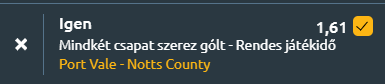 - A 6. helyen álló Port Vale fogadja a 2. helyen parkoló Notts County-t az angol Liga 2-ben. A Port Vale nehéz időszakon megy keresztül, hiszen legutóbbi hat mérkőzésükön nem tudtak kapott gól nélkül lehozni egy találkozót sem, és összesen 12 gólt kaptak ez idő alatt. Mind a támadási oldalon, mind a védekezési oldalon előfordulnak a gólok, ezt bizonyítja a legutóbbi 3-3-as meccsük a 15. helyezett Swindon Town ellen. Darren Moore csapata korábban már legyőzte a Notts Countyt 1-0-ra októberben, amikor stabil védekezésük mellett hatékony kontrákat vezettek, de azóta gyengült a formájuk, különösen a védelem tekintetében! Hazai pályán két győzelem mellett egy vereség és három döntetlen áll a nevük mellett az utóbbi időszakból, így nem mutatnak meggyőző formát. Ezzel szemben a Notts County jól szerepelt az utóbbi találkozókon. Stuart Maynard együttese kiemelkedő formában van, hiszen az elmúlt 10 mérkőzésükből nyolcat megnyertek, és csupán egyet veszítettek el, ráadásul idegenben is négy meccses győzelmi sorozatban vannak, amely során 12 gólt szereztek és mindössze négyet kaptak. Figyelembe véve Port Vale védelmi gondjait és a Notts County stabilitását, az esélyek inkább a vendégek győzelme felé billennek, de a hazai pálya előnye elég kell, hogy legyen egy gólra. A vendégsiker mellett a döntetlenre is van esély, no meg a gólváltásra is.