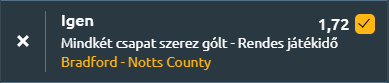 - Az angol Liga 2 tabelláján 2. helyen álló Bradford City a 6. helyezett Notts County csapatát fogadja. Mivel mindkét csapat célja az automatikus feljutás elérése, ez egy parázs hangulatú, izgalmas meccs lesz! A hazai pályán játszó Bradford City jelenleg a 2. helyen áll, de csak két ponttal előzi meg a 4. helyezettet, és az elmúlt három meccséből kettőt is elveszített, köztük a legutóbbit drámai módon, hiába vezettek többször is Swindon ellen. A formájuk ingadozó, viszont hazai pályán kiemelkedően teljesítenek: 51 pontot szereztek 21 mérkőzésen, ami a legjobb hazai mutató a ligában. A vendég Notts County is fontos három pont reményében utazik Yorkshire-be, mivel jelenleg a 6. helyen állnak, de csupán három ponttal előzik meg a rájátszáson kívüli zónát. Ők is vereségből érkeznek, ráadásul két egymást követő mérkőzést veszítettek el, így számukra is létfontosságú a győzelem, ha életben akarják tartani az automatikus feljutás esélyét. Egy szoros, küzdelmes meccs várható, ahol a hazai pálya előnye miatt a Bradford lehet enyhén esélyesebb, de a Notts County sem fog könnyen fejet hajtani. Mindkét csapatnak egészen jó támadói vannak, így emiatt-, és a nagy tét miatt is várható a gólváltás!
