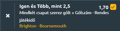 - A Brighton hazai stabilitása és gólgazdag mérkőzései, valamint a Bournemouth tartós idegenbeli védekezési problémái, és támadó stílusa alapján egy újabb eseménydús találkozó várható több góllal!