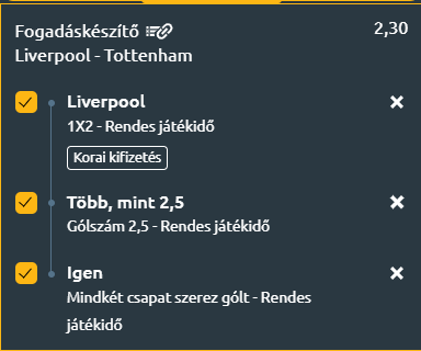 - A papírforma és a körülmények alapján Liverpool győzelme szinte borítékolható. A hazaiak bombaformában vannak, óriási a tét számukra, ráadásul az Anfielden verhetetlenek mostanság, míg a Tottenham figyelme már inkább az Európa Ligára irányul, viszont nem engedhetik meg maguknak, hogy feltett kezekkel fussanak ki a pályára. A Liverpool támadni fog, szervezi a meccset, de egy-egy kontrából betalálhat a Spurs is. A fogadáskészítővel hoztam létre a tippet: Liverpool nyer + mindkét csapat szerez gólt + több, mint 2,5 gól a meccsen
