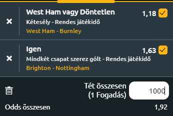 - Brighton – Nottingham: Mindkét csapat rossz formában van, két meccs óta nem tudtak nyerni, ma ezen szeretnének változtatni.December eleje óta nem jó a Brighton formája. Az elmúlt 12 meccsen mindössze három győzelmet arattak, és 39 ponttal a 9. helyre estek vissza a tabellán. Három pont a lemaradásuk a 7. helytől, de a Wolves, a Chelsea és a Fulham is csak egy, kettő, illetve négy ponttal van mögöttük. A Brighton remek, támadó focit játszik, de amíg a szezon elején abszolút eredményesek is voltak, most már jó két-három hónapja szenvednek a gólszerzésben, ráadásul a védelem is gyenge. Az elmúlt 12 meccsen csak három meccset fejeztek be kapott gól nélkül, és öt meccsen nem szereztek gólt. Hat mérkőzés BTTS-sel és hat 2,5 gól feletti találattal zárult. Nagyon figyelni kella Brightonnál, mert ha tartósodik a rossz szereplés, akkor még jobban lecsúszhatnak a tabellán. Nottingham az utolsó hét meccsén öt vereséget szenvedett. Nuno eddig nem tudott javítani ezen a csapaton. Két lenyűgöző győzelemmel kezdett a Manchester United és a Newcastle ellen, de azóta a Nottingham gyengén szerepel. Az utolsó 10 meccsükből hét gólváltás és 2,5 gól feletti, nyolc pedig gólváltással végződött. Tipp: Mindkét csapat szerez gólt!